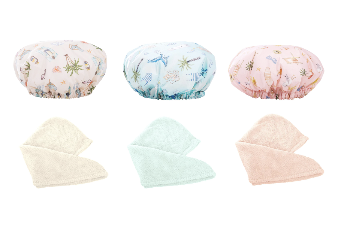 Includes polyester shower cap and super-absorbent microfibre turban towel.