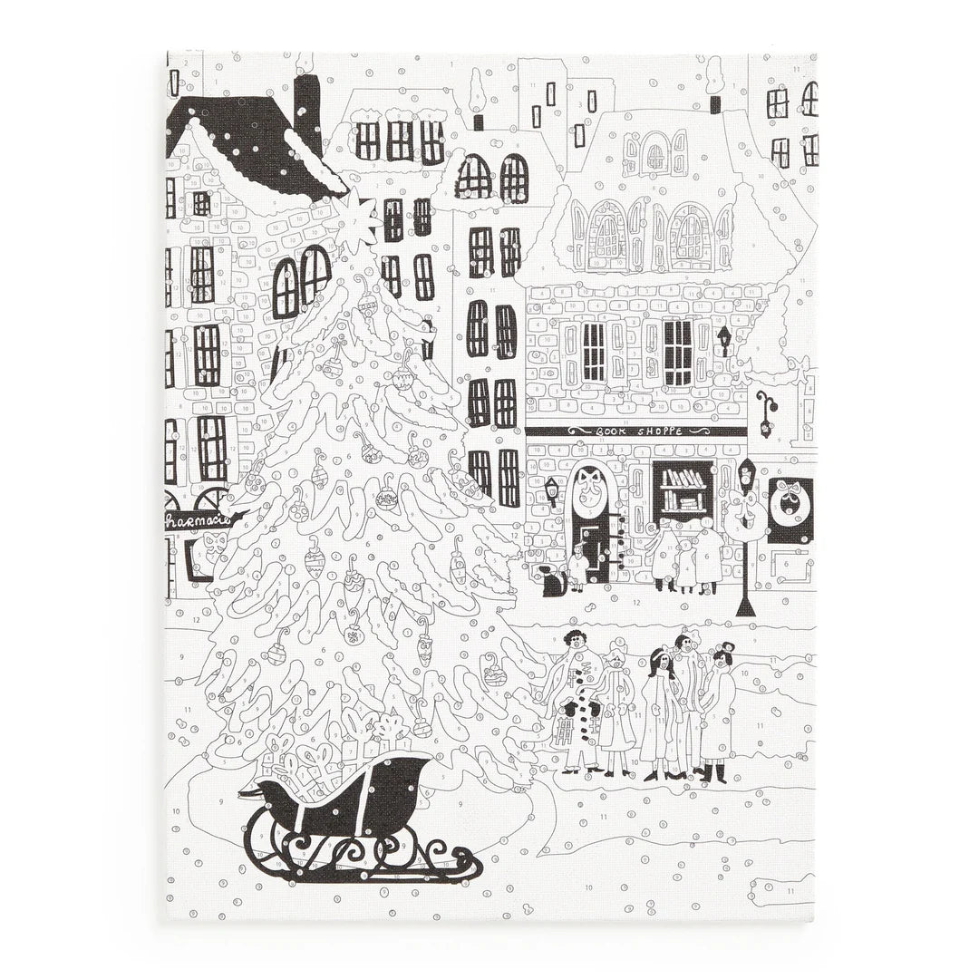 PAINT BY NUMBER KIT – The Joy Laforme Christmas Square 9x12 Paint by Number Kit from Galison includes everything you need to create a beautiful winter city scene, featuring a cheerful, colorful depiction of a decorated Christmas tree.