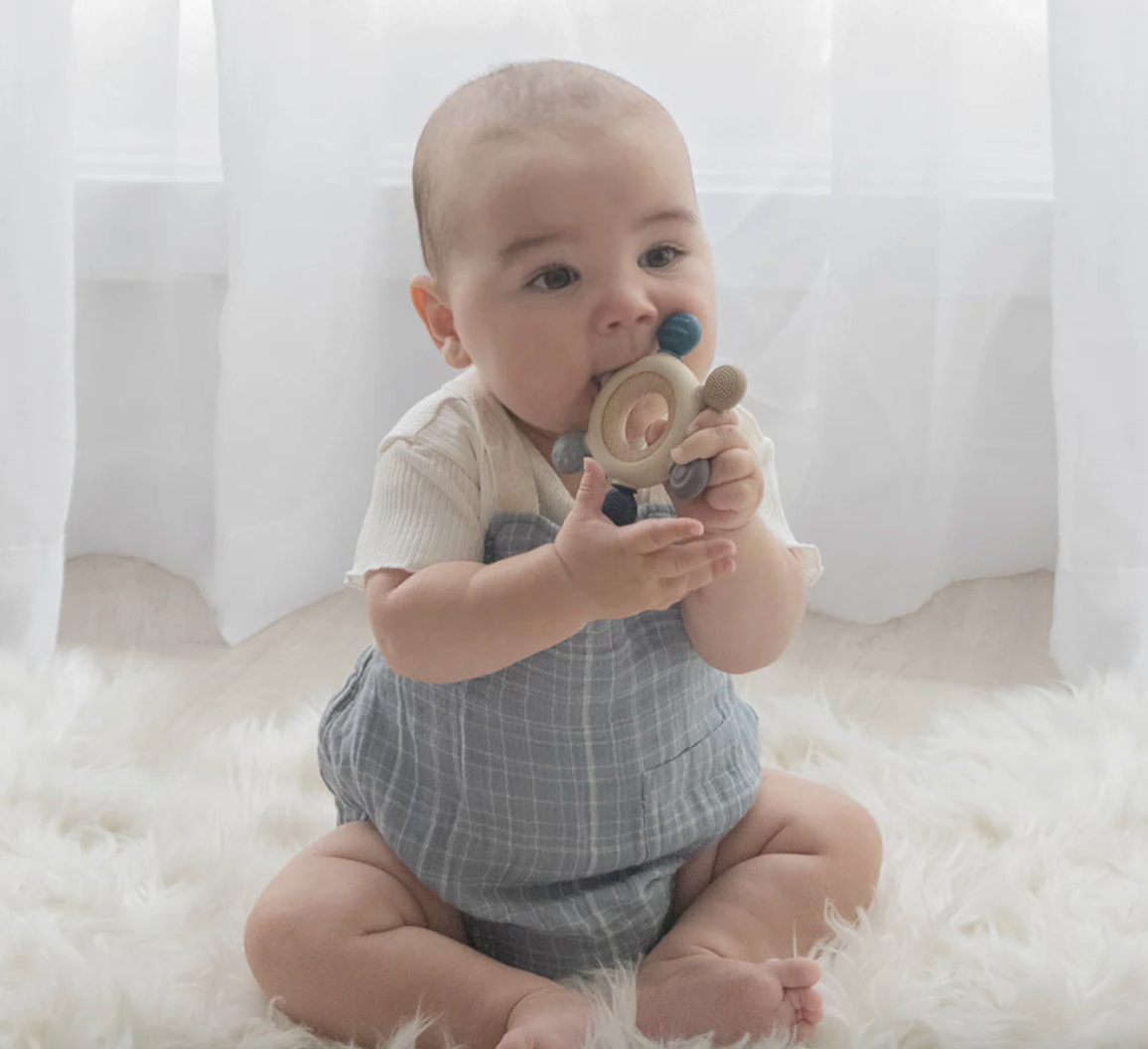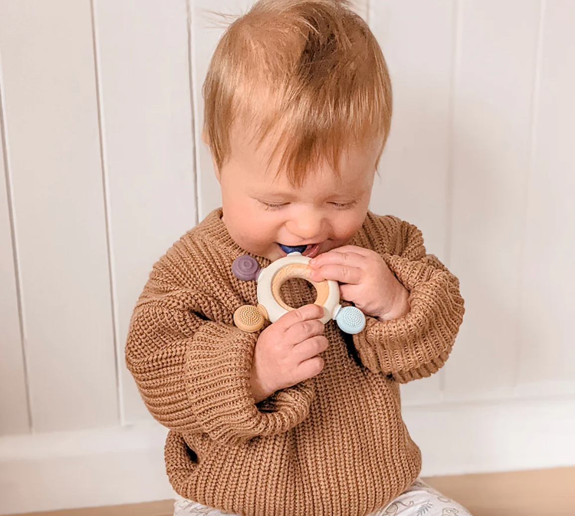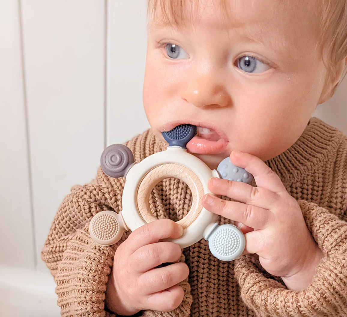 Keep curious little hands and mouths occupied with this multi-textured silicone and beechwood teether. Made from BPA-free, food-grade silicone, the unique designs allow for safe, sensory exploration and are perfect for soothing sore gums safely.