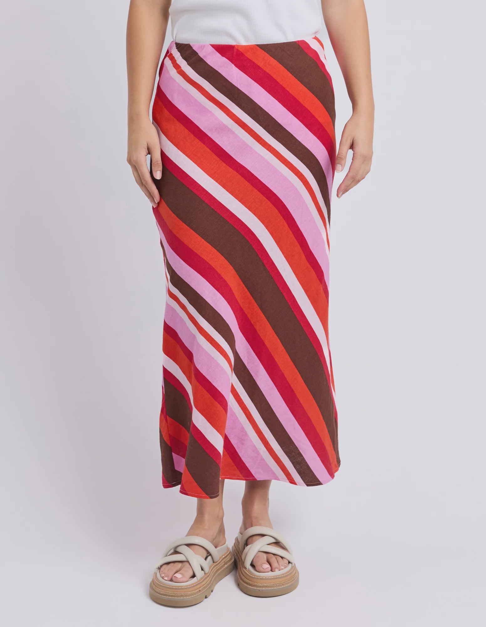 Bright and playful, the Guava Stripe Skirt adds a pop of colour to your summer look. Designed with a bold vertical stripe pattern, this midi length style is made from a soft linen blend for breathable comfort. The elastic waist offers an easy fit, perfect for relaxed days or warm evenings out.