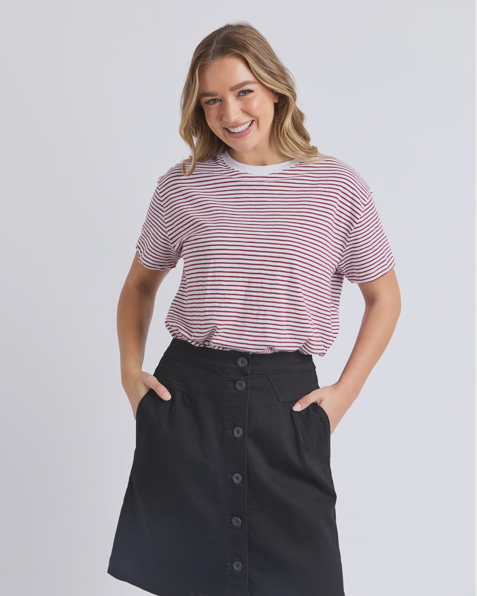 The Hutch Stripe Tee is a fresh everyday essential with a timeless stripe design. Made from soft 100% cotton, this tee features a yarn dyed stripe pattern, contrast plain neckband, and an easy boxy fit. Perfect for relaxed days and simple styling.