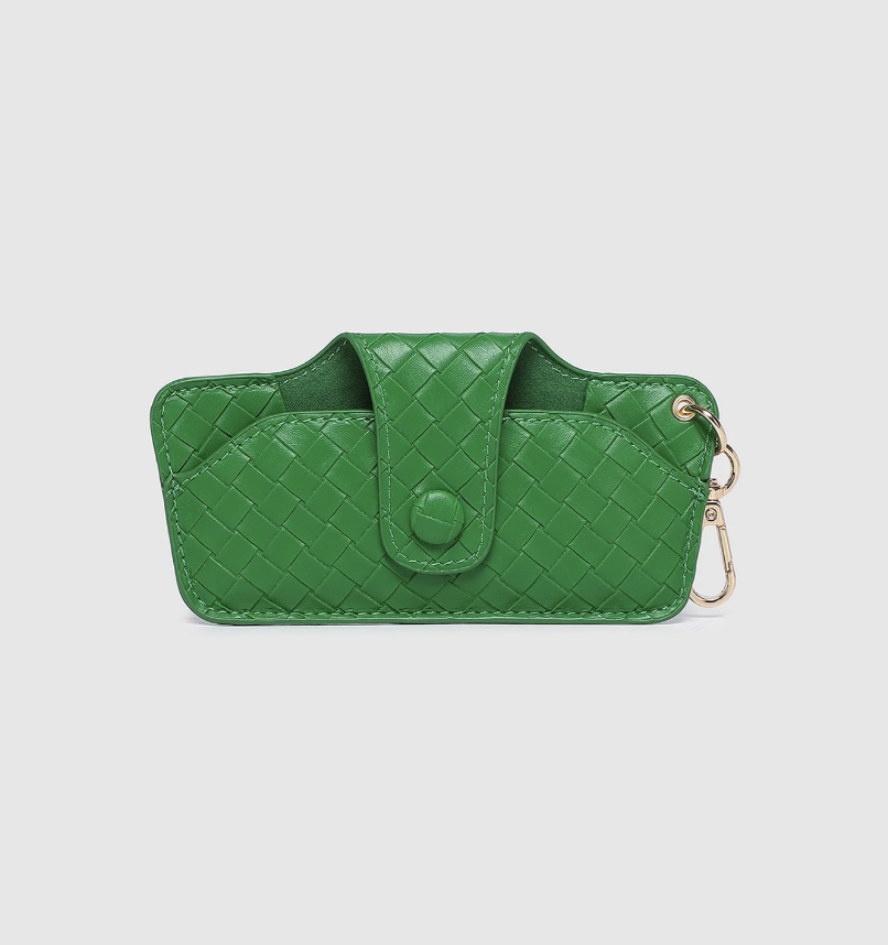 The Skittle Woven Green Sunglass Case is the perfect blend of style and functionality for your everyday eyewear. For ultimate convenience, effortlessly attach to your keys or handbag with the light gold hardware keyring clasp. Without compromising on style, the exterior features a gorgeous woven vegan leather, while the interior is lined with soft suede material to keep your everyday eyewear protected. Whether it's your favourite sunglasses or your reading glasses, they will stay protected and safe with the secure metal clasp. Designed in many gorgeous shades to suit everyone's style, the Skittle Woven Green Sunglass Case makes the perfect gift for any occasion.